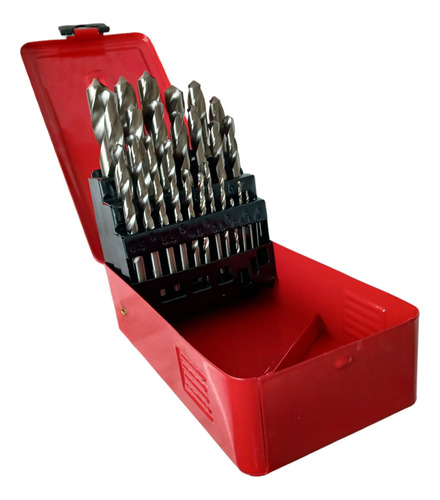 El juego de brocas de acero rápido (HSS) incluye 25 piezas con medidas desde 1 mm hasta 13 mm, cubriendo un rango completo para trabajos de perforación. Estas brocas están diseñadas para trabajar en materiales como acero, metales no ferrosos, madera y plásticos, ofreciendo buen rendimiento y durabilidad. El acero rápido proporciona resistencia al desgaste y permite mantener el filo a velocidades de corte adecuadas. Es un set ampliamente utilizado en talleres, mantenimiento industrial y aplicaciones profesionales, compatible con taladros eléctricos, de banco o portátiles para perforaciones precisas y continuas.